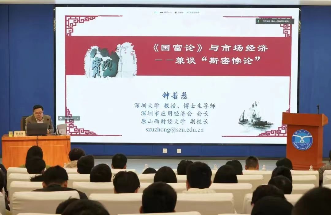 仪式结束后,钟若愚教授为学院师生带来题为《<国富论>与市场经济——兼谈“斯密悖论”》的专题讲座。他以“斯密悖论”为线索,着重解析亚当·斯密《国富论》、《道德情操论》、《法学演讲集》“三位一体”的学说体系,并结合当代中国发展之现实阐述“市场的逻辑”。