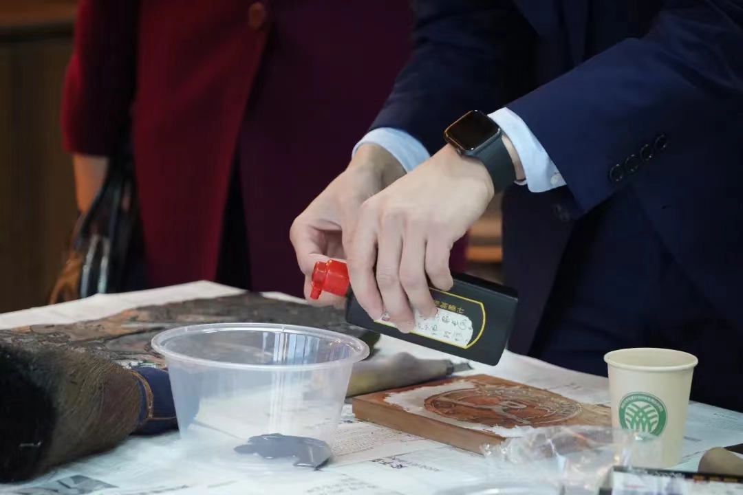 会议结束后,与会领导及学生前往学院非遗体验工作坊,体验东昌府木板年画制作方法。