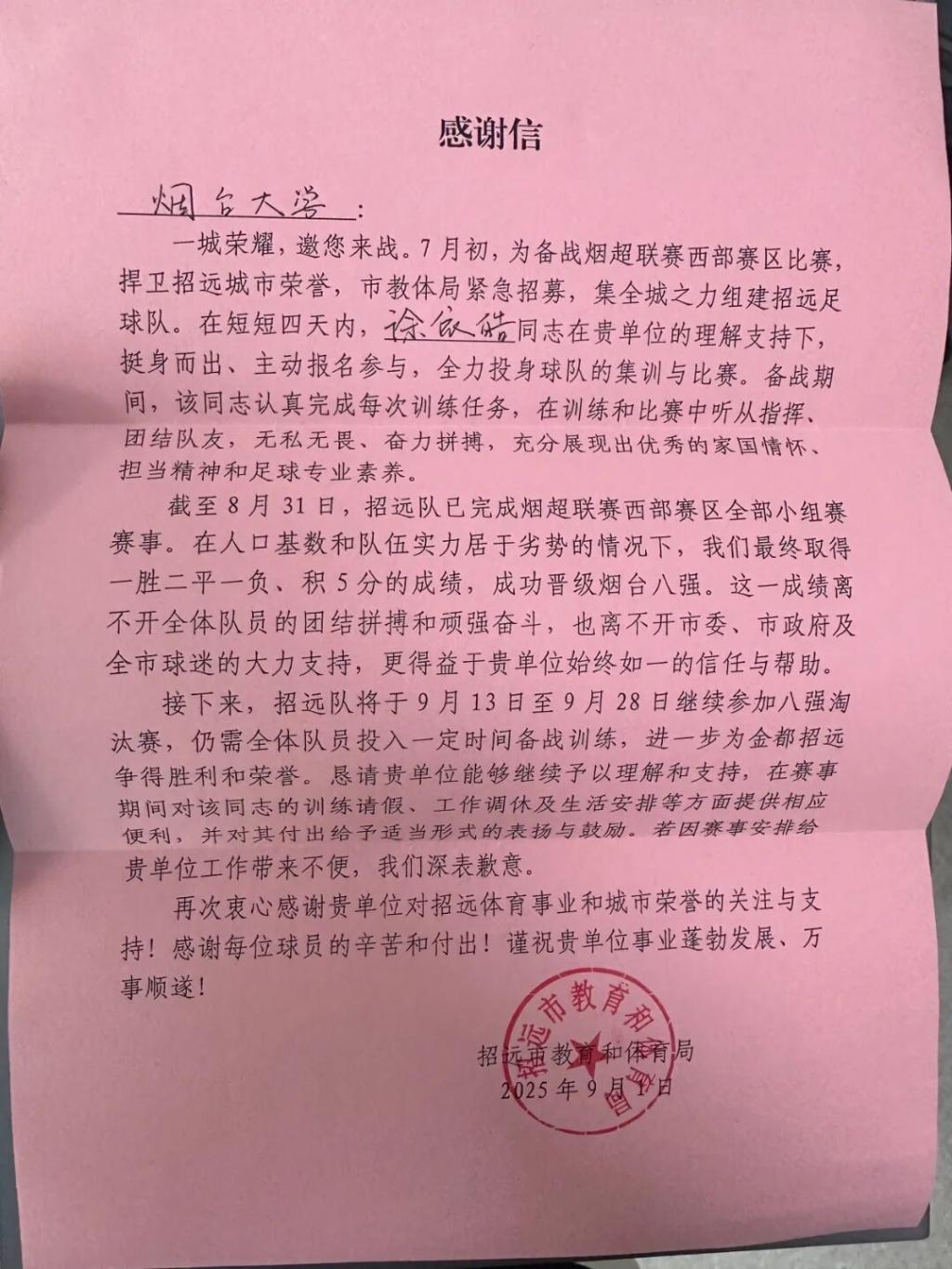 近日,招远市教育和体育局向我院学子徐依皓发来感谢函,对其在2025年烟台城市足球超级联赛中的出色表现予以高度肯定,感谢他为赛事顺利推进及当地足球运动推广作出的积极贡献。