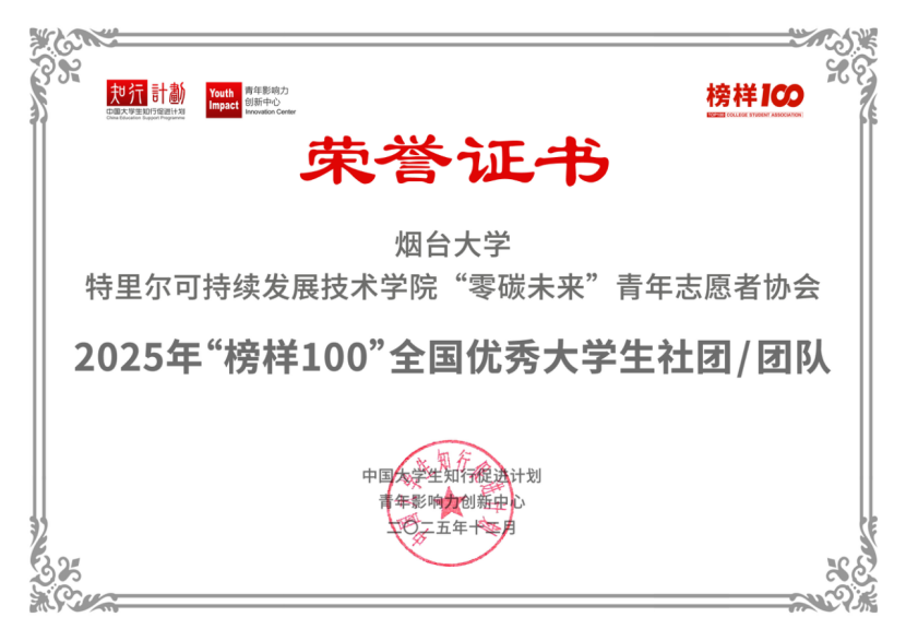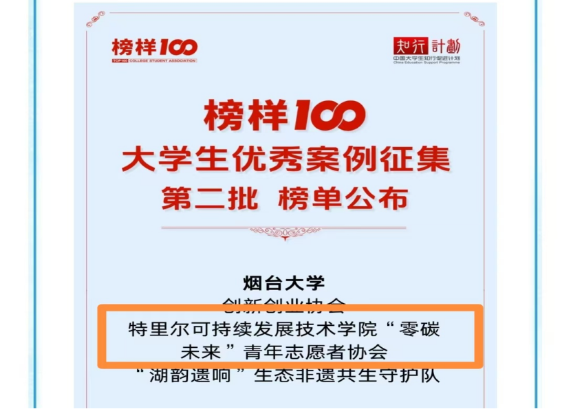 近日,tyc太阳成集团9728中德特里尔学院“零碳未来”青年志愿者协会获评全国“榜样100”优秀社团。这份荣誉是对我院学子践行可持续发展理念的高度认可。