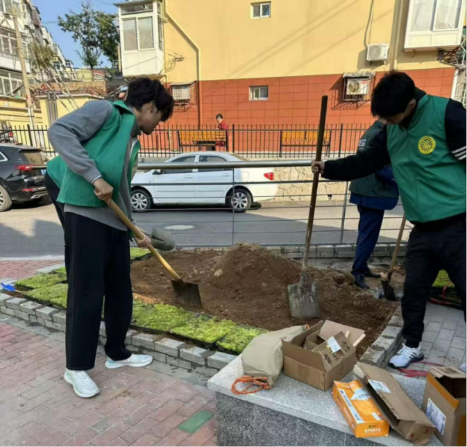 与此同时,在同学们的辛勤努力下,嫩绿的草坪在社区中如画卷般逐渐铺展。那片充满生机的绿色,恰似为社区铺上了一层柔软舒适的地毯,给人带来无尽的愉悦之感。日后,居民们可以在这里悠然漫步、惬意休憩,尽情地领略大自然赋予的清新与美好,感受那份宁静与惬意。