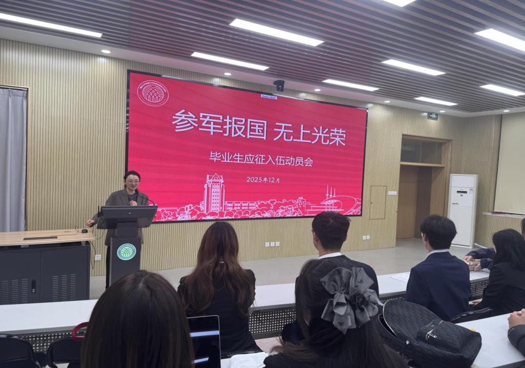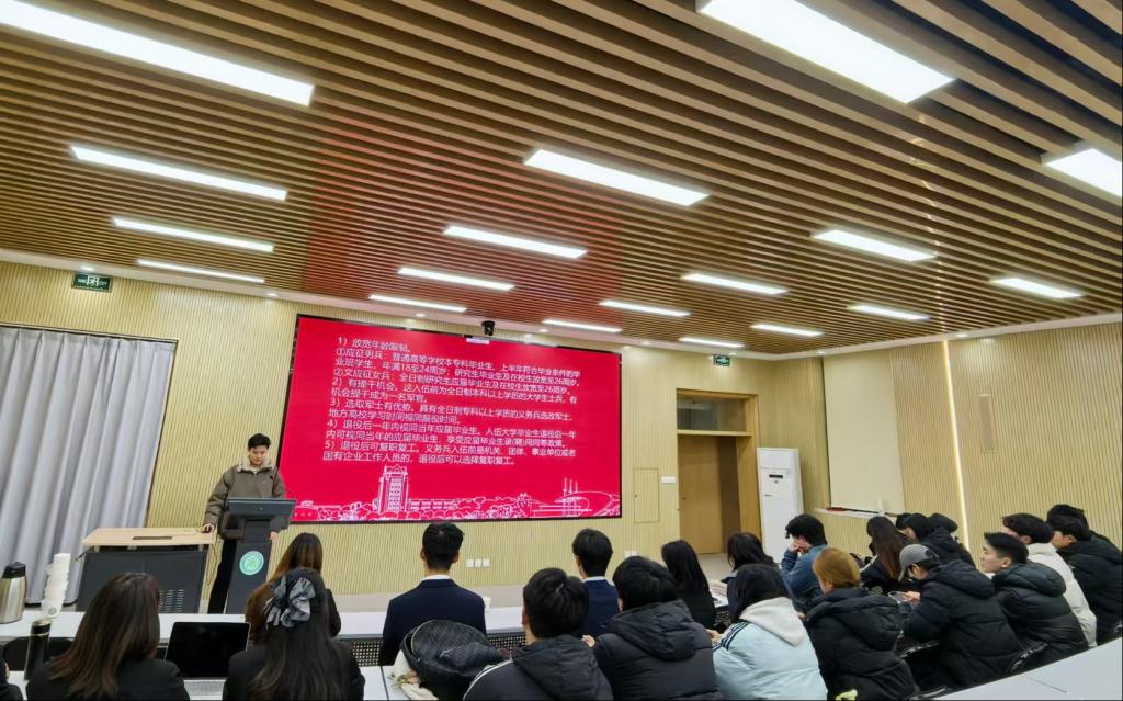 2026年全国征兵(男兵)应征报名已经开始,为鼓励2026届毕业生了解相关政策,12月4日晚,学院召开应征入伍动员会,全面解读参军政策。会议由辅导员曲季主持,就业部刘闻多同学宣讲,毕业生代表参会。