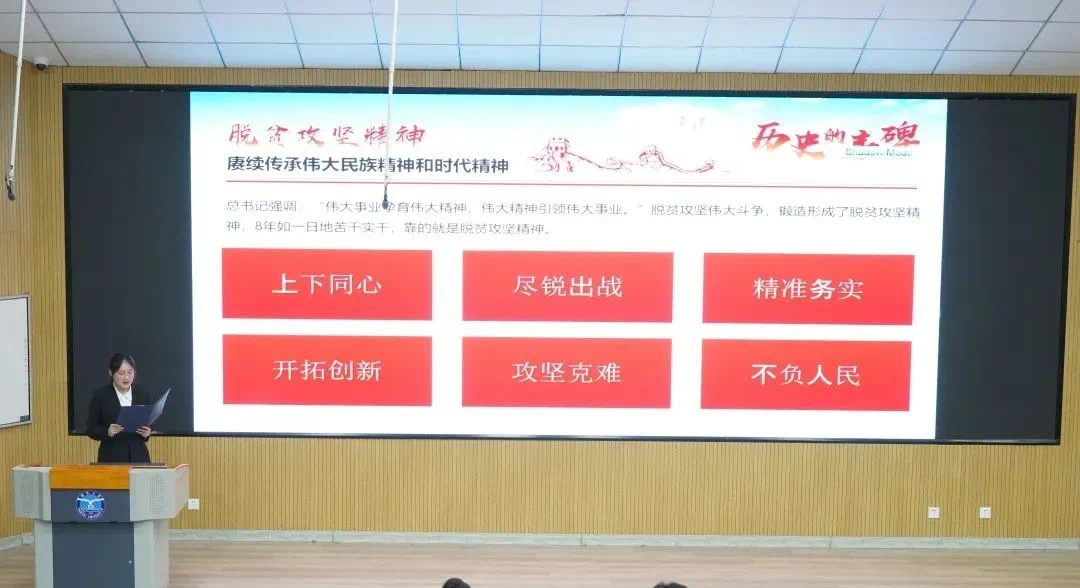 宣讲团成员中德212-1班宋锦媛以“何为脱贫攻坚”问题入手,开始了主题为《弘扬脱贫攻坚精神,奋发巾帼力量》的宣讲。她先后介绍了新时代扶贫攻坚的六个特色与脱贫攻坚优秀代表黄文秀的感人事迹,阐释了伟大脱贫攻坚精神。她表示,作为新时代的女大学生,要弘扬脱贫攻坚精神,自强不息,奋发巾帼力量!