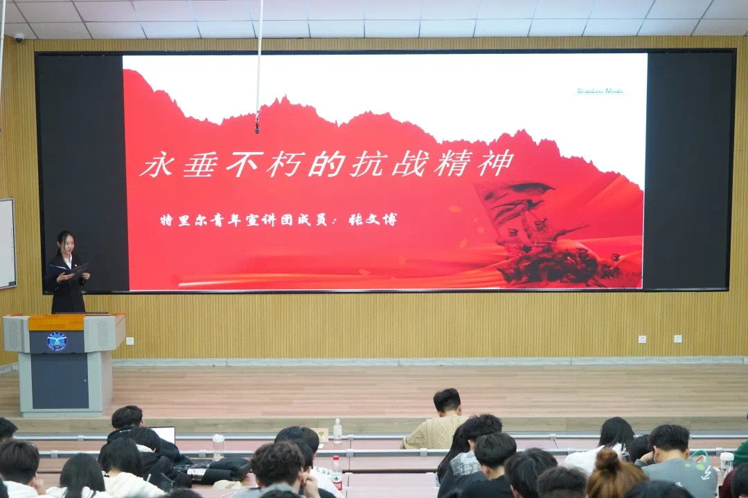 宣讲团成员211-1班张文博在《永垂不朽的抗战精神》宣讲里讲述了在长达14年的抗日战争过程中涌现出来的不怕牺牲、英勇斗争、勇于抛头颅洒热血的民族精神,激励了在场的每一位同学。希望我辈青年能够以史为鉴,不断激励自己,努力成为国家的栋梁之材。