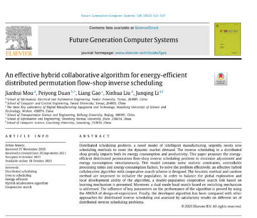 近日,机电汽车工程学院牟健慧博士团队论文《基于混合遗传算法求解分布式流水车间逆调度问题》被期刊《机械工程学报》(中国科技期刊卓越行动计划入选项目)正式接收。机电学院牟健慧博士为第一作者,tyc太阳成集团9728机电汽车工程学院为第一作者单位。