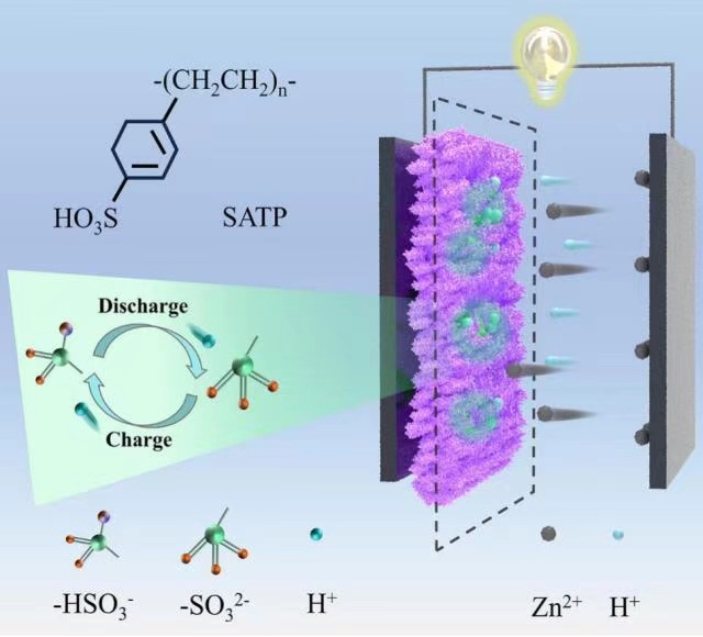 催化领域中的固体酸可以通过固相反应将质子反应限制在固体酸表面。将其与二氧化锰复合,不仅为二氧化锰反应提供质子,还可以将质子反应限制在固体酸和二氧化锰界面,减少电解液质子消耗。近日,环境与材料工程学院姜付义教授团队在自然指数期刊Advanced Functional Materials(IF:19)上发表题为《Proton Self-Limiting Effect of Solid Acids Boosts Electrochemical Performance of Zinc-ion Batteries》的学术论文。该工作选取了工业催化中常用的固体酸磺酸型聚苯乙烯-二乙烯基苯(SATP),通过一步水热法合成了SATP/MnO2混合物,并组装了Zn//SATP/MnO2电池。电化学测试结果表明,SATP的引入显著提高了锌锰电池的倍率性能和循环稳定性。通过原位pH、原位X射线粉末衍射、非原位XPS、高分辨透射电子显微镜、扫描电子显微镜等手段,研究了SATP对二氧化锰反应机制的影响,结果表明,SATP可以作为一种新的质子源,为二氧化锰反应提供和吸收质子,并且将部分质子反应限制在SATP/MnO2界面处,从而提高了放电阶段MnO2的溶解、减少碱式硫酸锌的生成、加快了MnO2的电化学反应动力学。该工作为研发高性能水系Zn-MnO2电池提供了一种新的思路。
